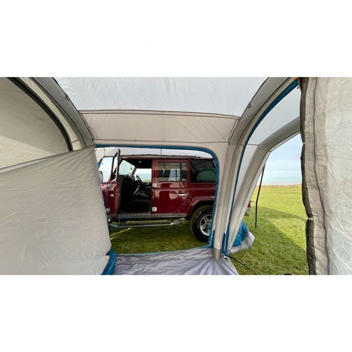 The Vango Magra awning is designed in the new size perfect for Land Rover Defenders, campervans and conversions. This inflatable awning has a front and back entrance so is ideal for left or right main van doors, creating the ideal set up on any campsite or holiday park.