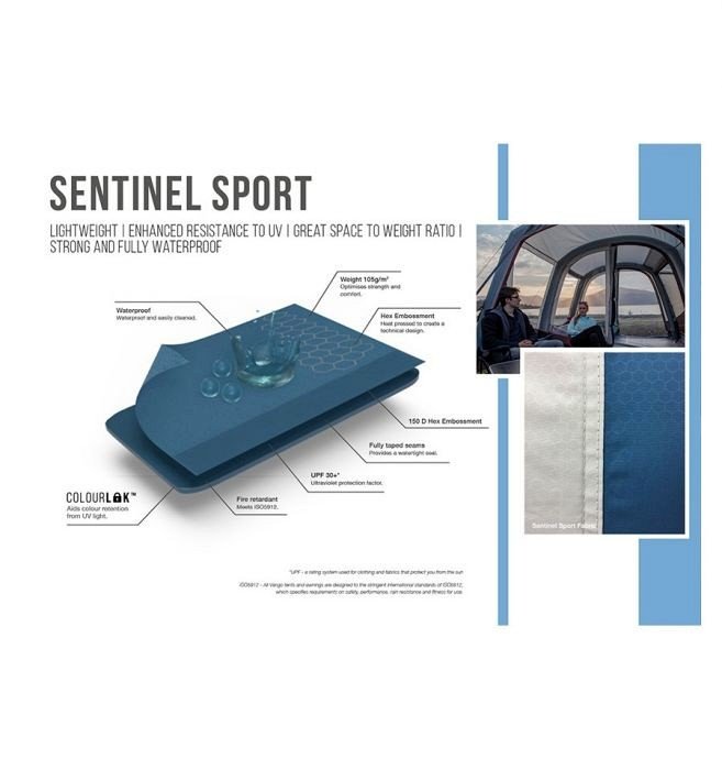 – Fully Wind & Rain Tested – Tested within wind conditions up to 100kph and heavy rainfall to the European standard EN5912 Sentinel Sport Fabric – A lightweight yet strong and waterproof fabric exclusive to the Vango Sport awning collection. Sentinel Sport features a great space to weight ratio while featuring a stylish hex embossed design. ColourLok™ technology aids colour retention from UV light