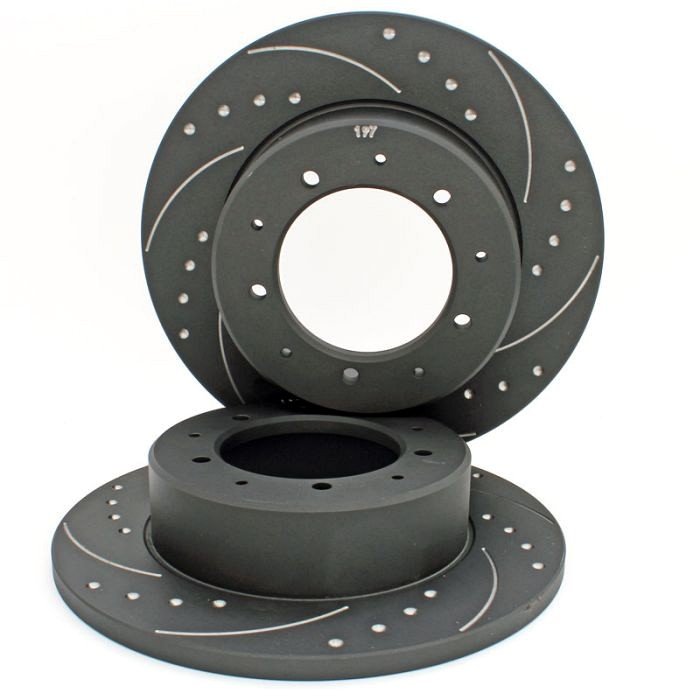 Rear POWERspec Brake Kit suitable for the Land Rover Defender 90 models, from 1994 – 2016. These kits are specially designed for Defender brake system where enhanced braking performance is required time after time. The brake discs have a dimpled and grooved design, with black phosphate finish for corrosion resistance and removal of debris and heat.