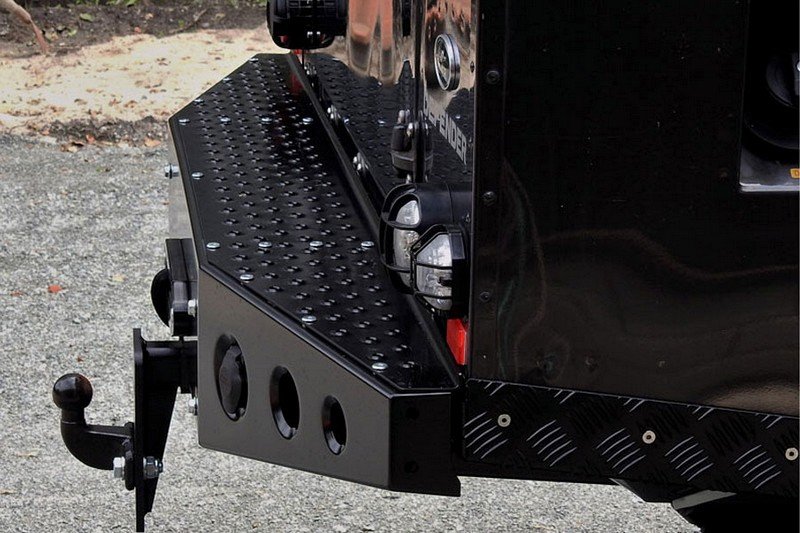 The rear bumper features the option to mount a TIBUS high-performance winch inside and comes with a receiver hitch mount and underbody protection. The removable top cover allows easy inspection of the winch without any hassle. Bumpers are custom-made upon request.