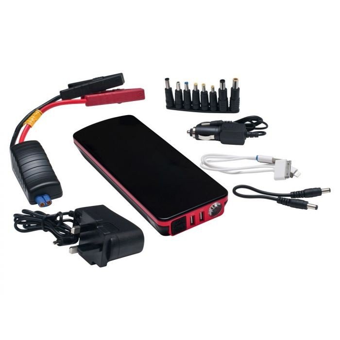 – Supports 12V jump starts as well as back up charging for many brands of mobile phones, laptops, tablets, portable refrigerators etc.